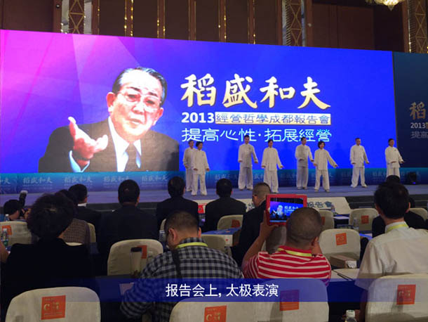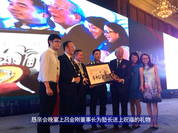 在報告會結束之後,就是例行的“懇親會”這是稻盛塾長自己親自規定的(de),因為在(zài)他的經營理念裏麵,這樣有利於聽員工的心聲(shēng)和彼此見的(de)一個關係(xì)融(róng)合。晚宴上成都盛(shèng)和塾為了表示對(duì)塾長的敬意和祝(zhù)福,呂(lǚ)金剛(gāng)董事長作為代表向稻盛塾長送上了成都形象標誌“太陽神鳥”,並(bìng)祝願稻盛塾長吉祥如意、福壽安康。