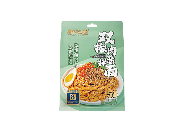 雙椒肉醬拌麵口味特點:四川特製鮮紅美人椒(jiāo)與小米泡椒雙椒碰撞,輔(fǔ)以醬香肉沫,豐富(fù)肉臊澆在麵條上(shàng),入口爆香。